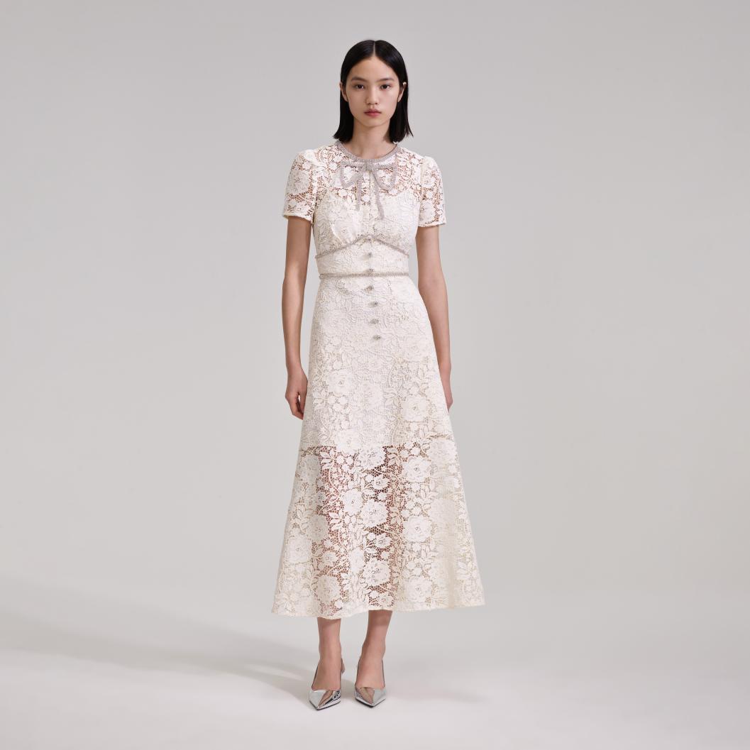 Crèmekleurige midi-jurk met koord en kant en strik in het wit | Zelfportretjurken