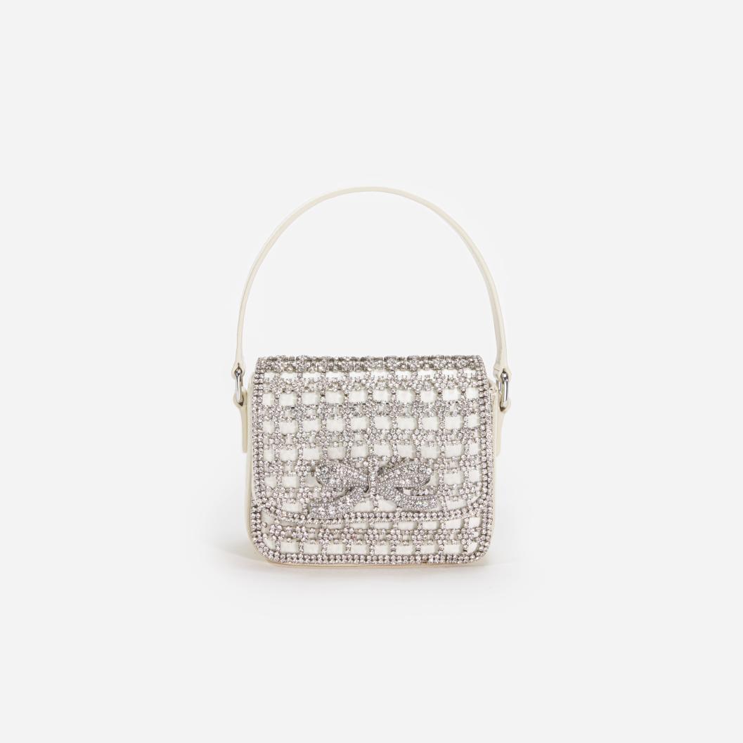 Er bestaat niet zoiets als te veel diamantjes, en dit microtasje – met zijn crèmekleurige maliënkolder met strik en schouderband – is daar een voorbeeld van. Combineer met onze statement oorbellen voor de ultieme finishing touch.