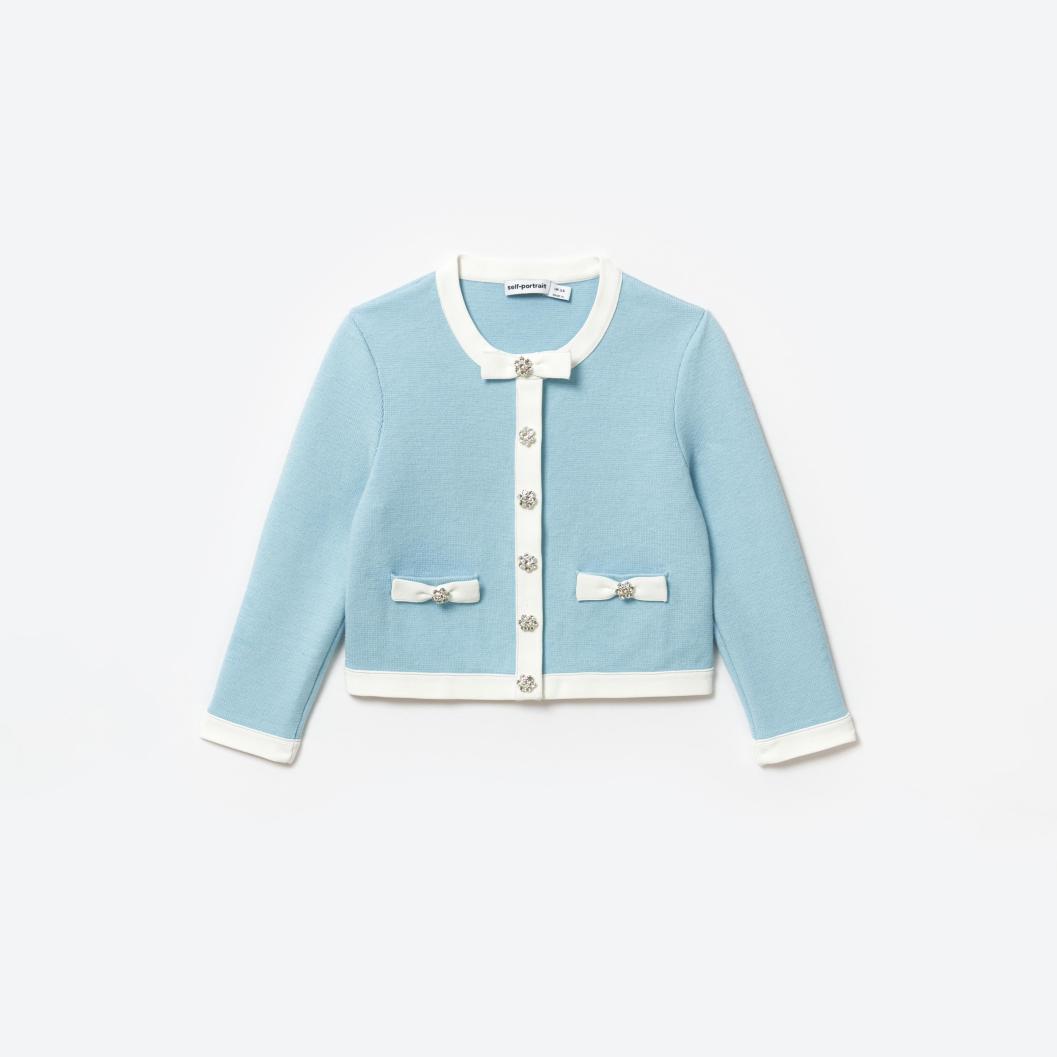 Gemaakt van zachtblauw breisel, geven contrasterende witte randen dit vestje een betoverende charme. Geaccentueerd met strass-bloemknopen en strikken, combineer het met de bijpassende rok voor een verzorgde feestelijke look.