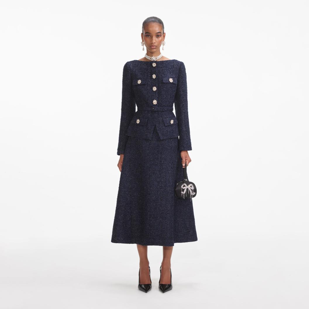 Marineblauwe metallic bouclé midi-jurk voor dames | Zelfportretjurken