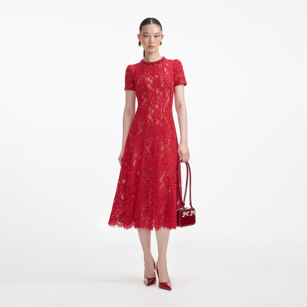 Rode midi-jurk met pailletten en kant voor dames | Zelfportretjurken