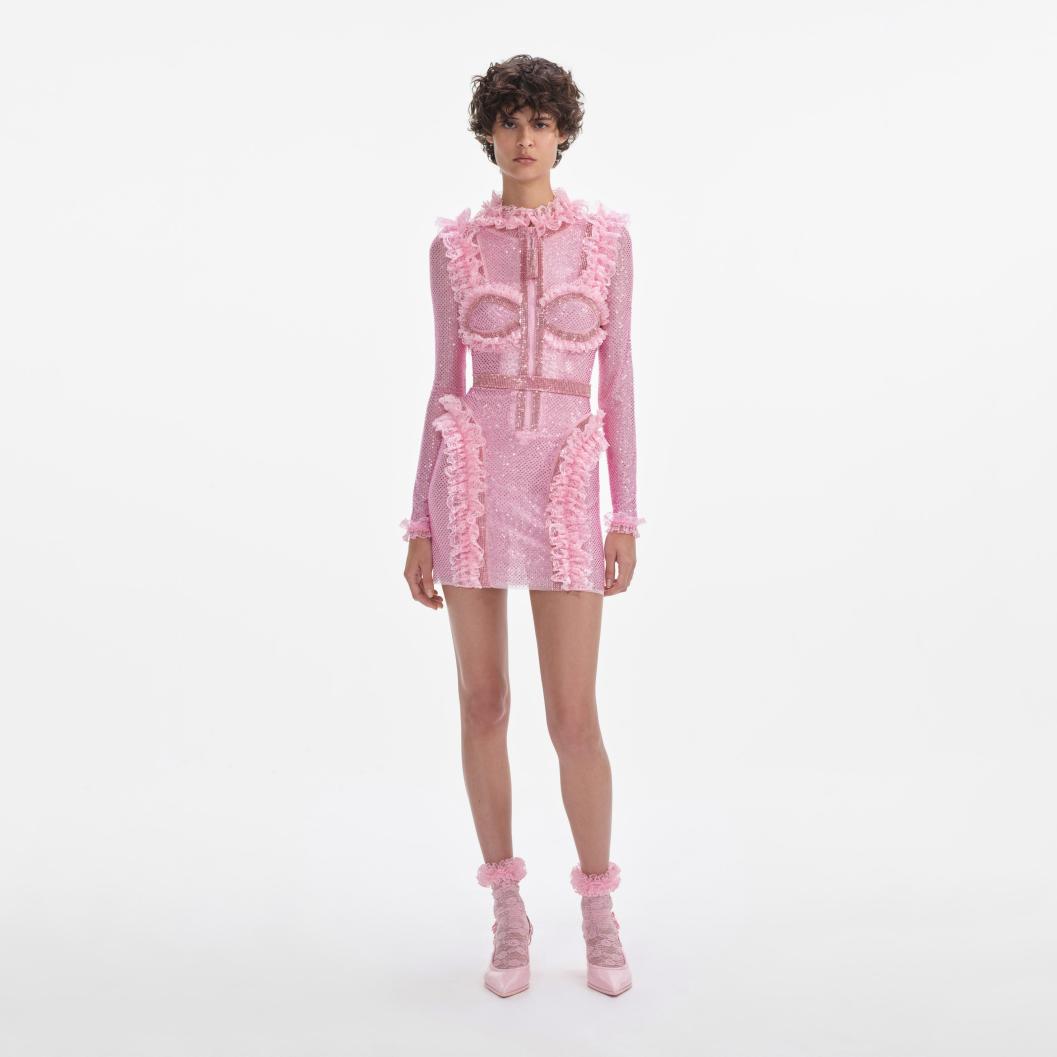 Roze mini-jurk met strass-mesh en ruches voor dames | Zelfportretjurken