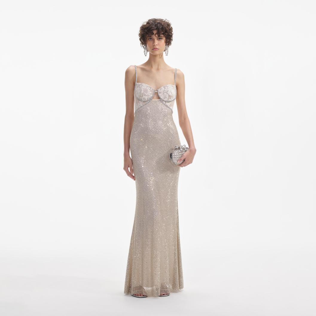 Vrouwen crèmekleurige maxi-jurk met strass-stof | Zelfportretjurken