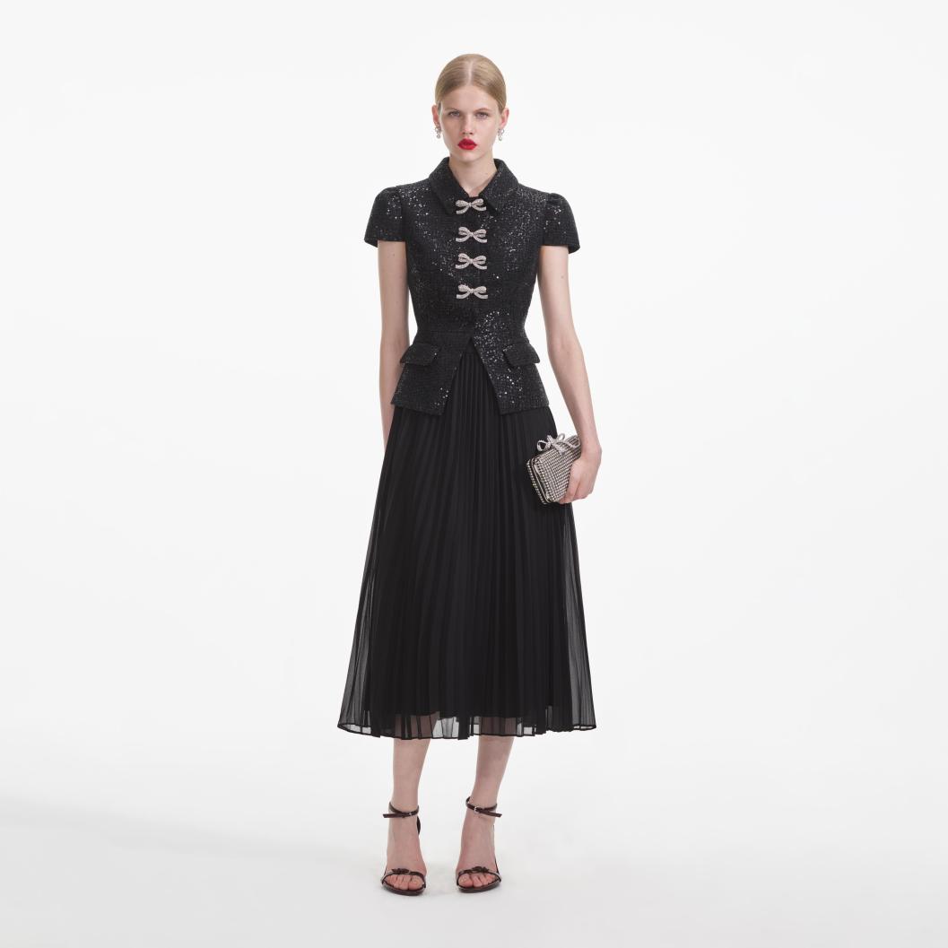 Zwarte bouclé midi-jurk met strik voor dames | Zelfportretjurken