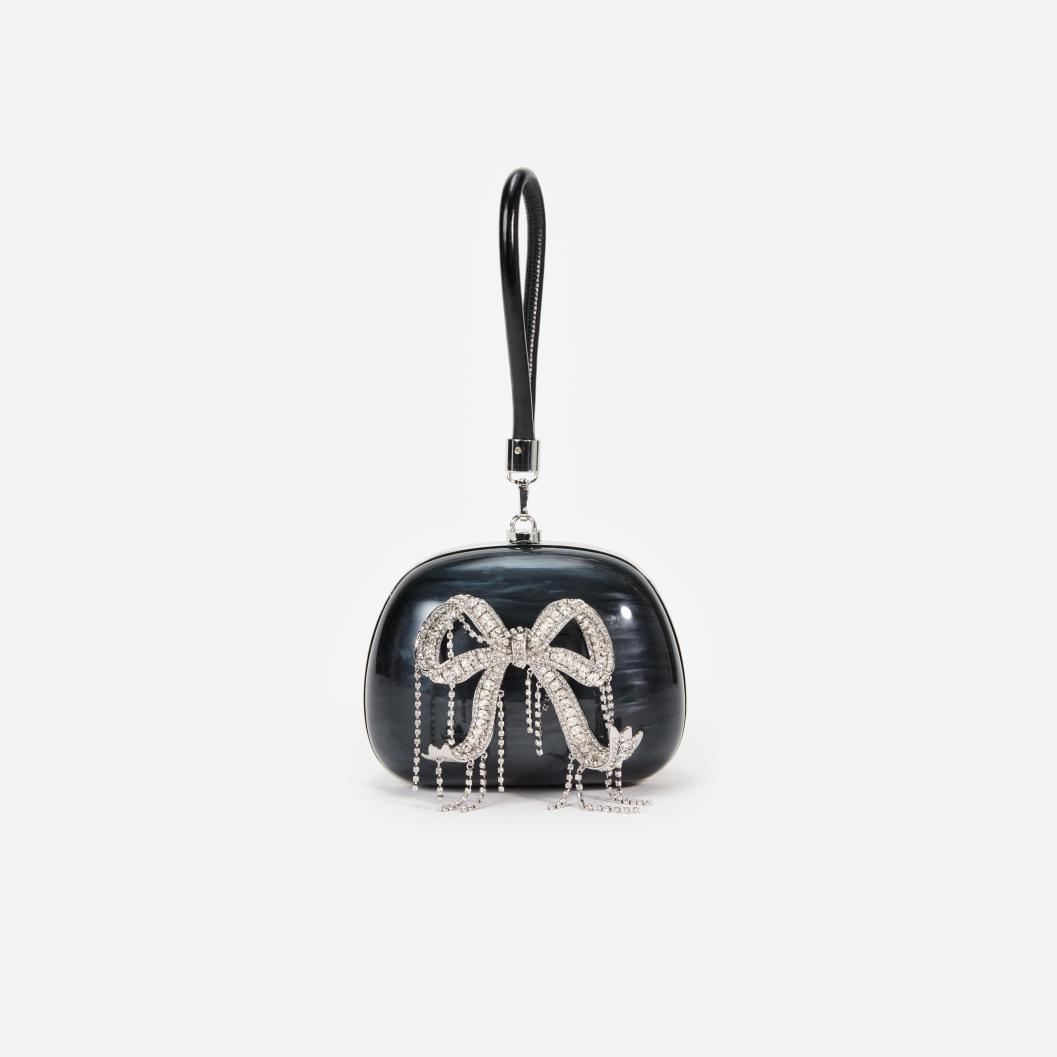Een sculpturale interpretatie van een huisstijl, deze polsclutch van acryl heeft een druipende strik met diamantjes voor een glamoureus effect. Combineer met onze statement oorbellen voor de finishing touch.