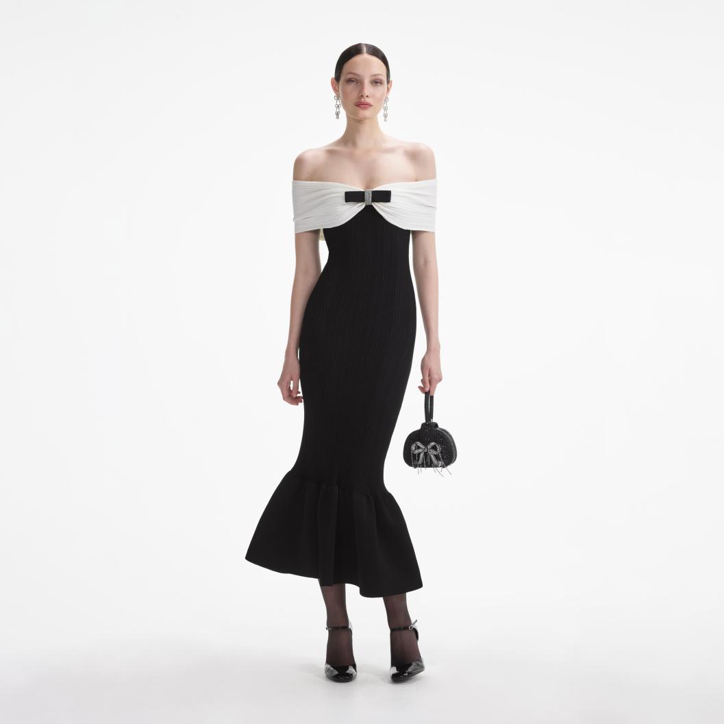 Zwarte gebreide midi-jurk met strik voor dames | Zelfportretjurken